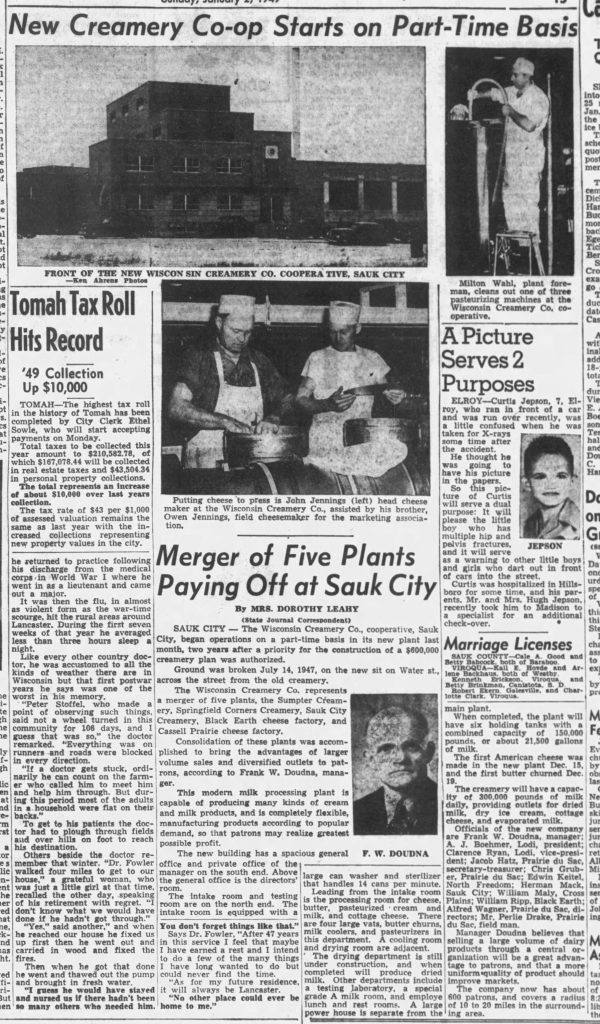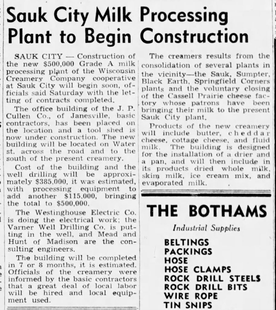 The construction, overseen by JP Cullen, began with a groundbreaking ceremony on July 14, 1947. The project was slated for completion within 7-8 months. This new facility unified the operations of the Sumpter Creamery, Springfield Corners Creamery, Sauk City Creamery, Black Earth Cheese Factory, and Cassell Prairie Cheese Factory, thereby enhancing production capacity and expanding market reach.